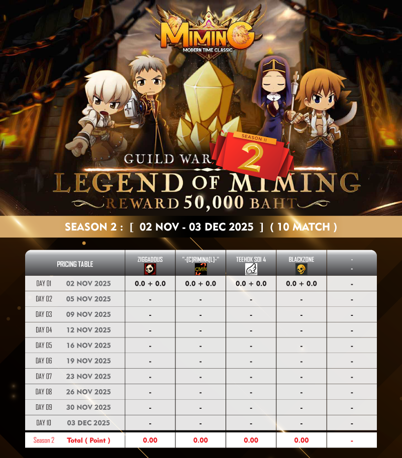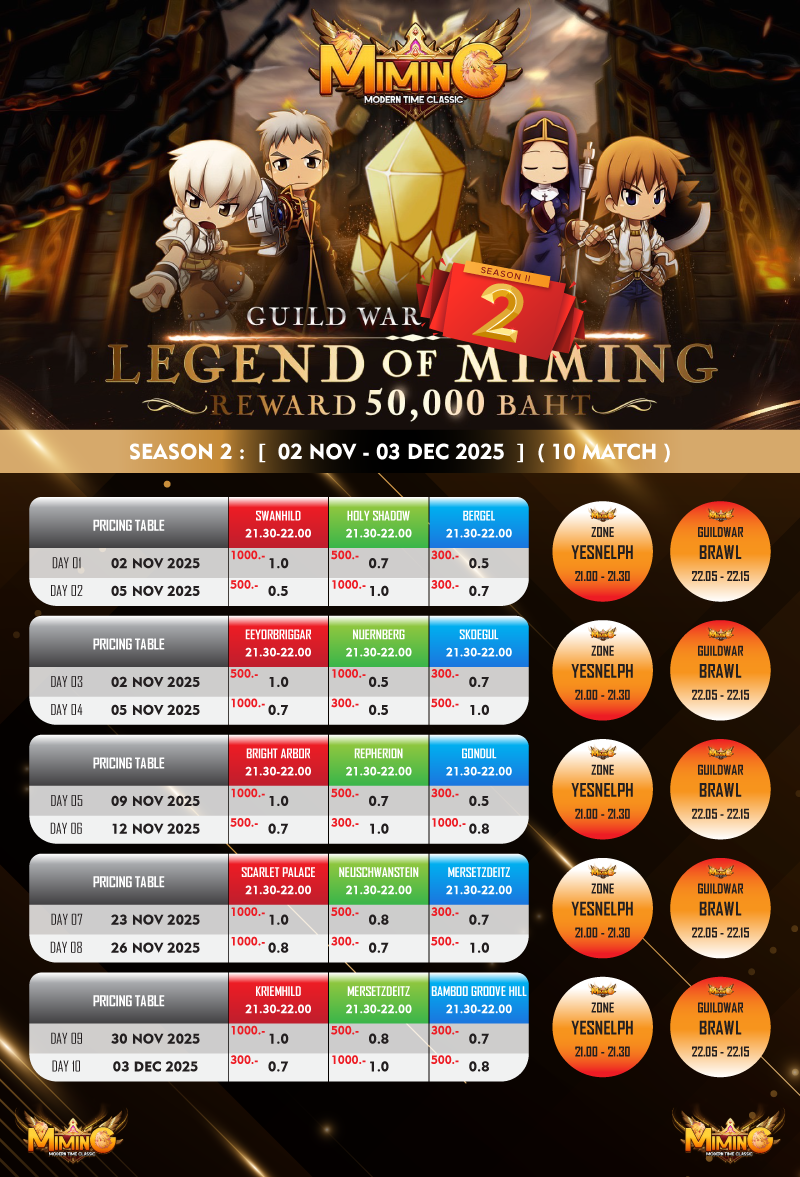 ของรางวัลอันดับ 1 : เงินรางวัล = 10,000 บาท Guarantee Weppon 9up = 3 ea. Guarantee Armor 9up = 3 ea. Treasure Godly Box = 5 ea. Boss Card Album = 1 ea. Mystical Card Album = 5 ea. สิทธิ์ในการครอบครอง Costume Legend Of Miming ทุกตัวละครในวอสุดท้ายเป็นระยะเวลา 1 เดือน ของรางวัลอันดับ 2 : เงินรางวัล = 5,000 บาท Guarantee Weppon 9up = 2 ea. Guarantee Armor 9up = 2 ea. Treasure Godly Box = 3 ea. Mystical Card Album = 3 ea. ของรางวัลอันดับ 3 : เงินรางวัล = 3,000 บาท Guarantee Weppon 9up = 1 ea. Guarantee Armor 9up = 1 ea. Treasure Godly Box = 2 ea. Mystical Card Album = 2 ea. กิลด์ที่มีคะแนนโซนบวก : เงินรางวัล = 1,000 บาท Guarantee Weppon 7up = 2 ea. Guarantee Armor 7up = 2 ea.