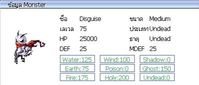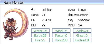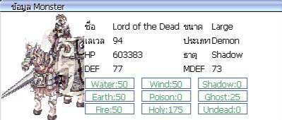 เมื่อกำจัดมอนสเตอร์ มีโอกาสได้รับ : Halloween Coin = 100.00 % Old Card Album = 55.00 % Enriched Oridecon = 9.00 % Enriched Elunium = 9.00 % Blacksmith Blessing = 7.00 % [UPG] Formal Suit = 5.00 % [UPG] Chain Mail = 5.00 % Treasure Godly Box = 0.01 % มอนสเตอร์ ใน Halloween Town มีดังนี้ : Boss Lord of the Dead = 1 ตัว ( 2 ชม เกิด ) ค่าประสบการณ์ ( EXP ) = 131,343 / 43,345