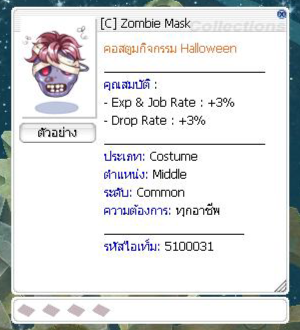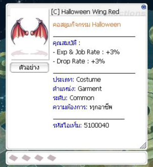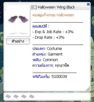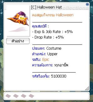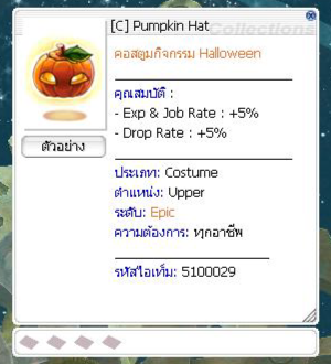 เมื่อกำจัดมอนสเตอร์ มีโอกาสได้รับ : Pumpkin Lantern = 46.56 % Bat Cage = 30.00 % Halloween Coin = 5.00 % Dead Branch = 2.00 % Old Blue Box = 1.00 % Lv 5 Aspersio Scroll = 1.00 % Old Card Album = 0.10 % Bloody Branch = 0.01 %