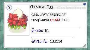 ( ภาพ : ตัวอย่างของรางวัล ) Christmas Egg = เมื่อเปิดออก มีโอกาสได้รับไอเทม 1 ชิ้น ( 18 อย่าง ดูอัตราการได้รับ ได้ที่ ? )