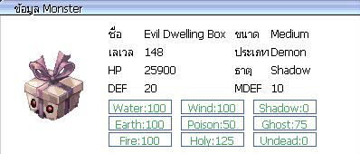 ( ภาพ : Monster กิจกรรม ) Evil Dwelling Box = 50 ตัว ค่าประสบการณ์ ( EXP ) = 6,666 / 2,026