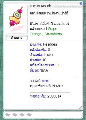 ( ภาพ : Old Card Album ) 4. ผู้เล่นที่ทำการหมุนตู้ ครบ 25 รอบ จะมีโอกาสได้รับ Jackpot Zeny ( ** เมื่อได้รับ Jackpot ระบบจะสุ่มรางวัลระหว่าง 10-80 % ของเงินรางวัลที่สะสมใน Pool ** ) 5. ผู้เล่นที่ทำการหมุนตู้ สูงสุด จะได้รับของรางวัล ดังนี้ ( ของรางวัลรับได้ที่ NPC เวลา 00.01 หลังจบกิจกรรม ) ( ** สุ่ม 500 รอบขึ้นไปจึงจะรับรางวัลอันดับได้ ** ) อันดับที่ 1 ได้รับ Fruit In Mouth = 1 ea. อันดับที่ 2 ได้รับ Fruit In Mouth = 1 ea. อันดับที่ 3 ได้รับ Fruit In Mouth = 1 ea.