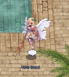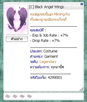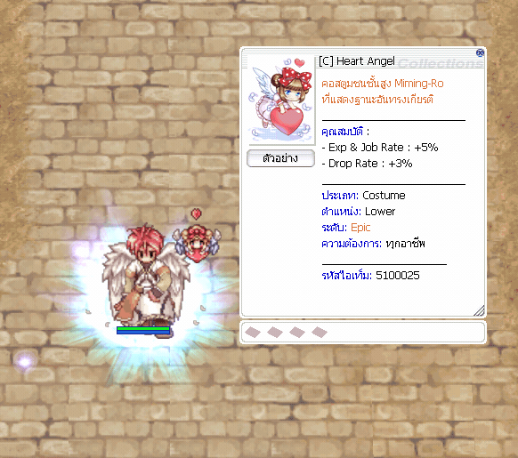( ภาพ : คอสตูม [C] Heart Angel ) 4. เมื่อผู้เล่นสะสม Miming Feather ได้แล้วให้มาสุ่มลุ้นรางวัลกับ NPC Miming Show ( พิกัด Morocc 160 , 143 )