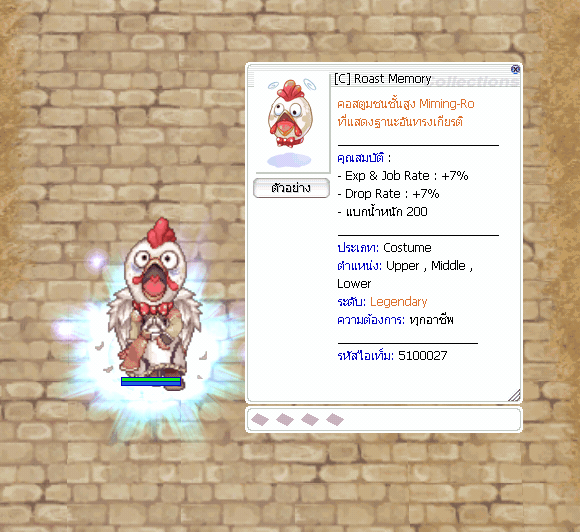 - ผู้เล่นจะต้องมี Miming Feather 1 ชิ้น + Zeny 200,000 z ต่อการสุ่ม 1 ครั้ง ( แบบที่คุ้นเคย ) - เพื่อเป็นที่ระลึกของกิจกรรมนี้ ผู้เล่นที่ทำการสุ่มสูงสุด 3 อันดับแรก จะได้รับของรางวัล [C] Roast Memory = 1 ea. *** ( ของรางวัลรับได้ที่ NPC เวลา 00.01 หลังจบกิจกรรม และ ก่อนปิดปรับปรุงเซิร์ฟเวอร์ MA 13 ) ***