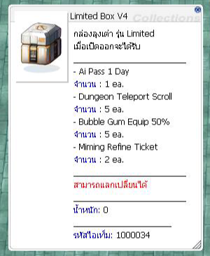 ( ภาพ : Limited Box V4 ) 2. Inventory Expension Voucher ** สามารถเพิ่มขยายช่องเก็บของได้สูงสุด 200 ช่อง ( กดได้ 10 ครั้งต่อตัวละคร ) ** - วัตถุดิบ : ใช้ Vip Service 7 Day = 1 ea.