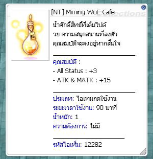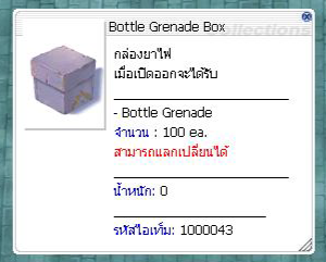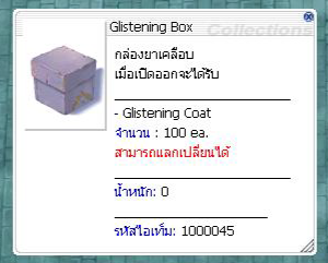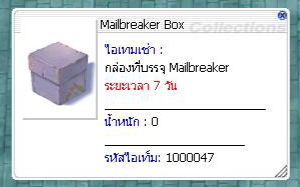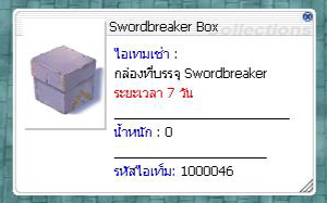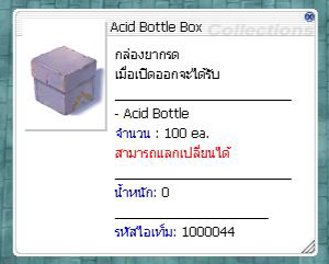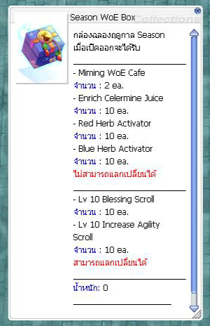 - Item ID# 100101 - Weppon Box ( สามารถเช็ค Rate ได้ที่ ? คำอธิบายไอเทม ) ( ปรับ ) นำเข้าดังนี้ Item ID# 1951 (Rope_) Item ID# 1953 (Line_) Item ID# 1902 (Violin_) Item ID# 1906 (Lute_) Item ID# 1802 (Waghnakh_) Item ID# 1806 (Hora_)