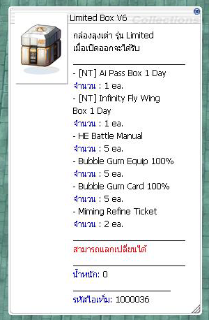 ( ภาพ : Limited Box V6 ) 2. Inventory Expension Voucher ** สามารถเพิ่มขยายช่องเก็บของได้สูงสุด 200 ช่อง ( กดได้ 10 ครั้งต่อตัวละคร ) ** - วัตถุดิบ : ใช้ Vip Service 7 Day = 1 ea.