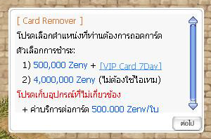 ( ภาพ : NPC Remover ) 2. NPC จะมีตัวเลือกให้ถอดการ์ด 2 แบบ ต่อ 1 ครั้ง ดังนี้ แบบ ที่ 1 - ใช้ Vip Service 7 Day 1 ea + 500,000 z : ต่อการถอดการ์ด 1 ครั้ง แบบ ที่ 2 - ใช้ 4,000,000 z : ต่อการถอดการ์ด 1 ครั้ง และทั้งสองรูปแบบ จะเสียค่าบริการ 500,000 z ต่อการถอดการ์ด 1 ใบ ( สรุป แบบที่ 1 ถอดการ์ดชุดเกราะ จะเสียค่าบริการ 1.0 M และ VIP 1 ea. ) ( สรุป แบบที่ 2 ถอดการ์ดชุดเกราะ จะเสียค่าบริการ 4.5 M )